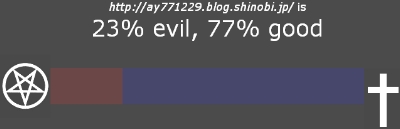 沒錯!就跟你/妳想的一樣,這個圖片中的數字代表著我的部落格的邪惡與善良指數。當然啦,如您所見,敝人的部落格可是純潔善良到不行阿,從那邪惡指數只有區區二十三個百分比便可分曉(你好像忘了向大家交代那個指數阿,其實每次測都會變動喔~),什麼?是這樣嗎?不過應該還是無損我的善良吧~